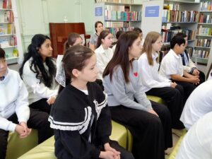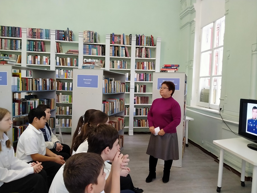 Специалист библиотеки рассказала ребятам о жизни и подвиге астраханского героя Азамата Бердиева, который ценой своей жизни спас сослуживцев из-под ракетного обстрела. Рассказ сопровождался презентацией. Был показан и видеоролик, снятый в память об Азамате Астраханским телевидением.