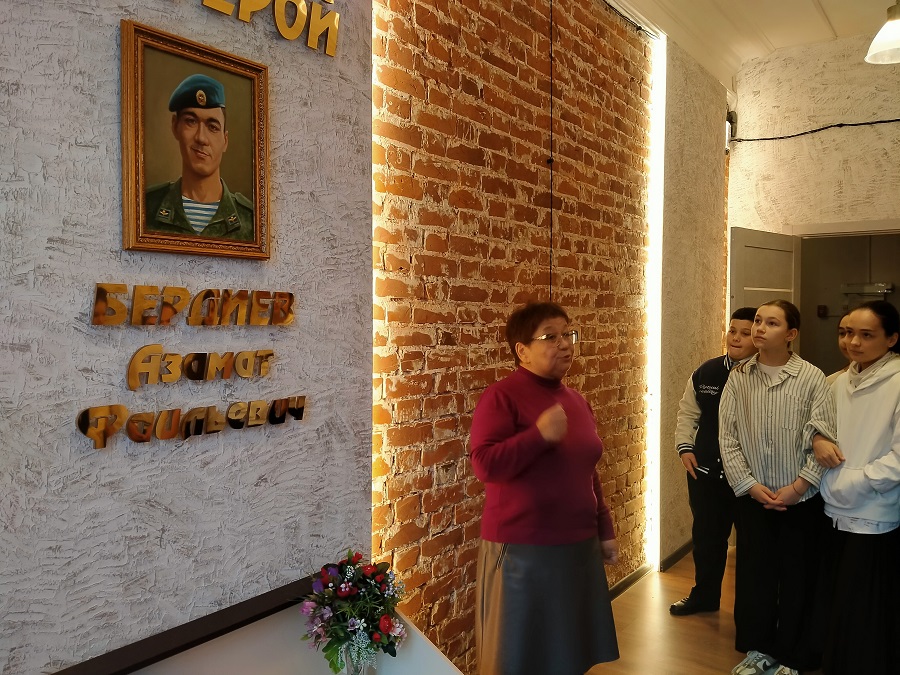 Затем участники мероприятия, семиклассник средней школы №11, посетили мемориальную комнату Героя России в помещении общества татарской национальной культуры «Дуслык» и посмотрели альбом с фотографиями о боевом пути Азамата.