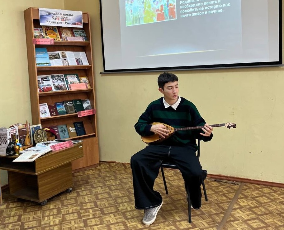 Гостей библиотеки ждал сюрприз. Для них с традиционными казахскими песнями выступил музыкант Айрат Маженов. Особую атмосферу добавило его исполнение на домбре, являющейся национальным инструментом казахов. Для тех, кто хотел бы подробнее узнать о народах, проживающих на территории России, была организована книжная выставка «Дружба народов — единство России».
